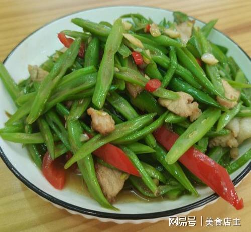 1.瘦肉切丝,加老抽、淀粉和油抓匀;四季豆切段焯水3分钟。
