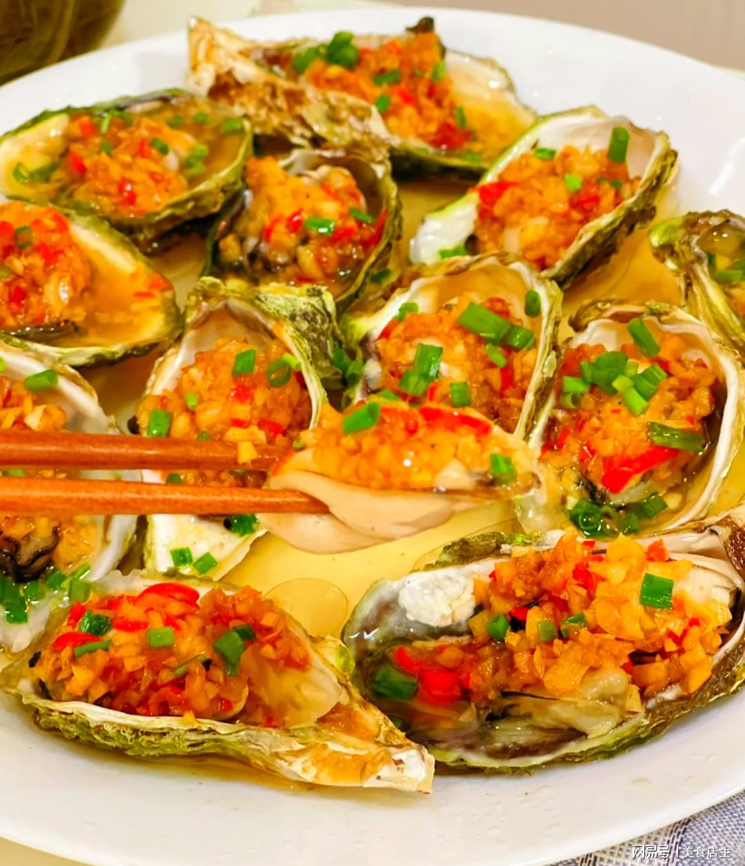 4、将生蚝捞出沥干水分,摆放在盘中,淋入调好的料汁,拌匀后即可食用。