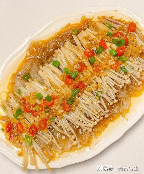 5、取出蒸好的金针菇,撒上切好的葱花和小米辣圈,锅中烧一些热油,淋在葱花和小米辣上,激发出香味即可上桌。