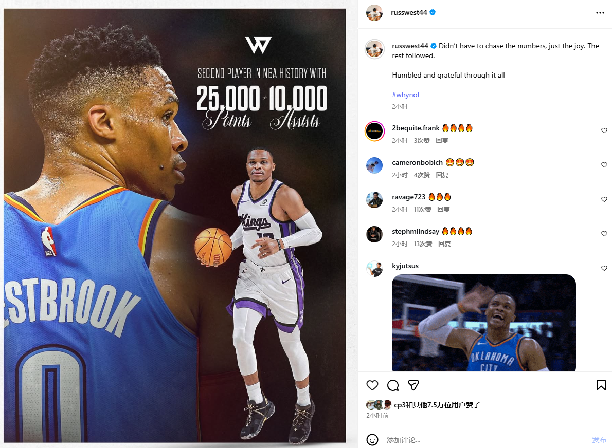 目前威少正拿着底薪合同为国王效力,今日威少晒出自己达成25000分+10000助攻的伟大成就,哈登、保罗、施罗德等人点赞祝贺。