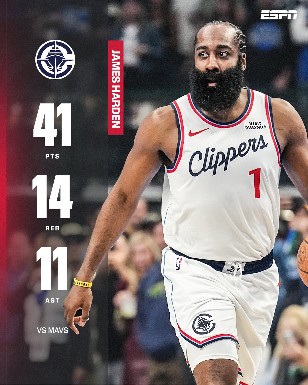 哈登疯狂一战连创多项纪录——时隔1703天再次拿到40+三双,拿到快船队史首个40+三双,生涯第17次轰下40+三双位居历史第二,生涯抢断数超越魔术师约翰逊升到历史第23位。