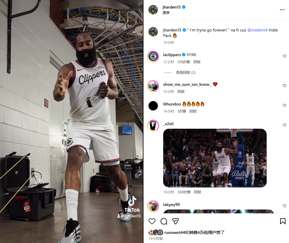 哈登苦战51分钟赛后仍加练,如此举动太感人,威少、比尔、克莱-汤普森都为他点赞,快船官方留言写道:H1M。