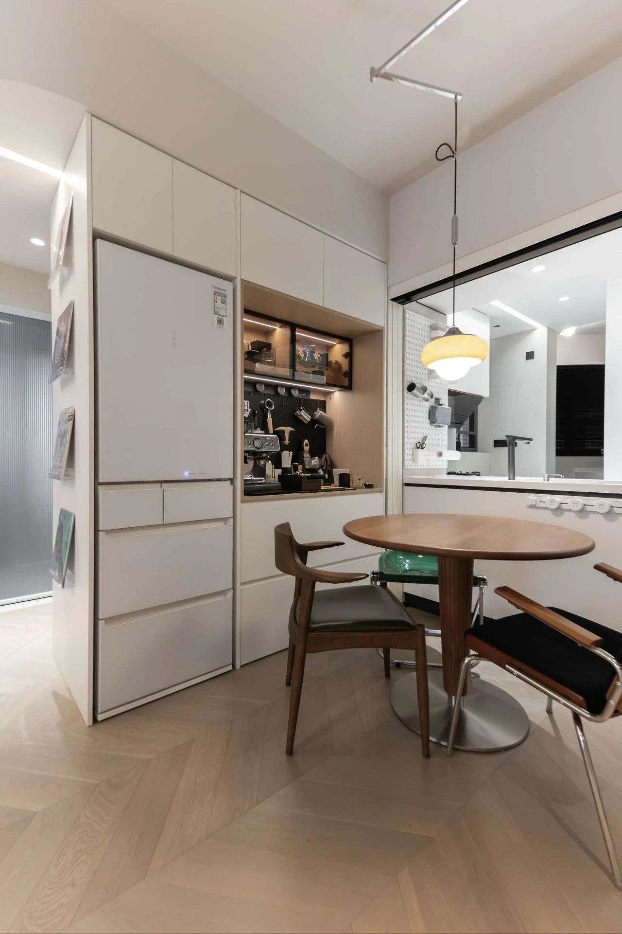 利用定制家居沿着餐厅墙面做了满墙储物柜,冰箱外置餐厅嵌入柜体,其余部分中间留空打造餐边咖啡角。