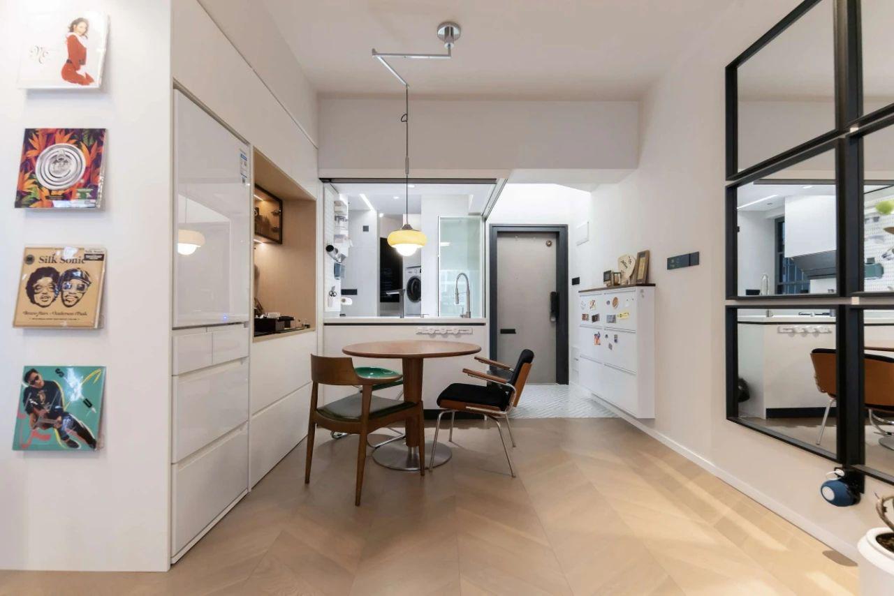 将餐厨之间的墙与厨房门垛拆掉,以推拉门+折叠门替代墙体做一个透明的“盒子”,打造半开放式厨房。