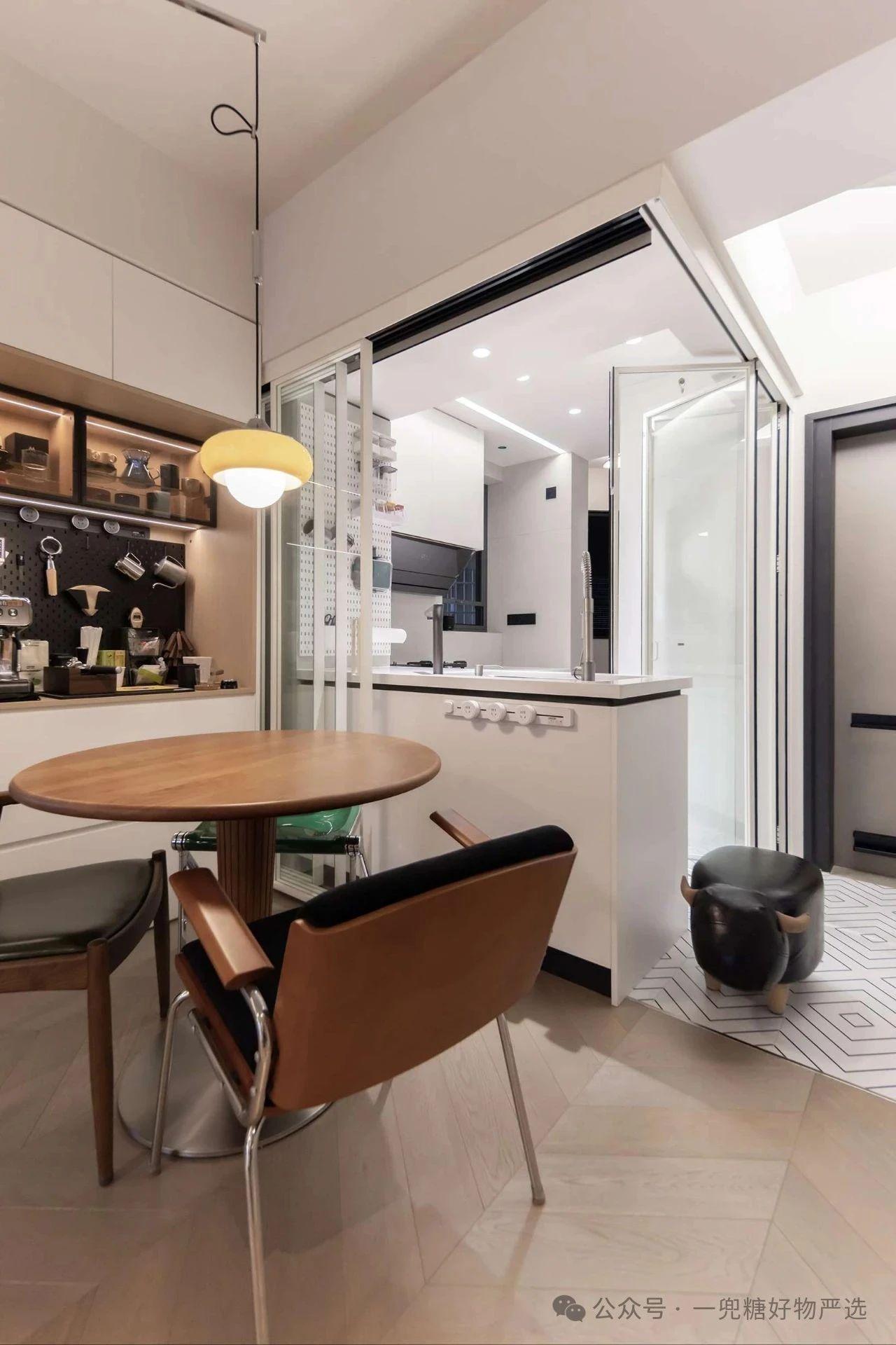 推拉门收入烟管墙与餐边柜之间,折叠门最大限度打开厨房入口,开拓厨房空间同时引入客餐厅光线。