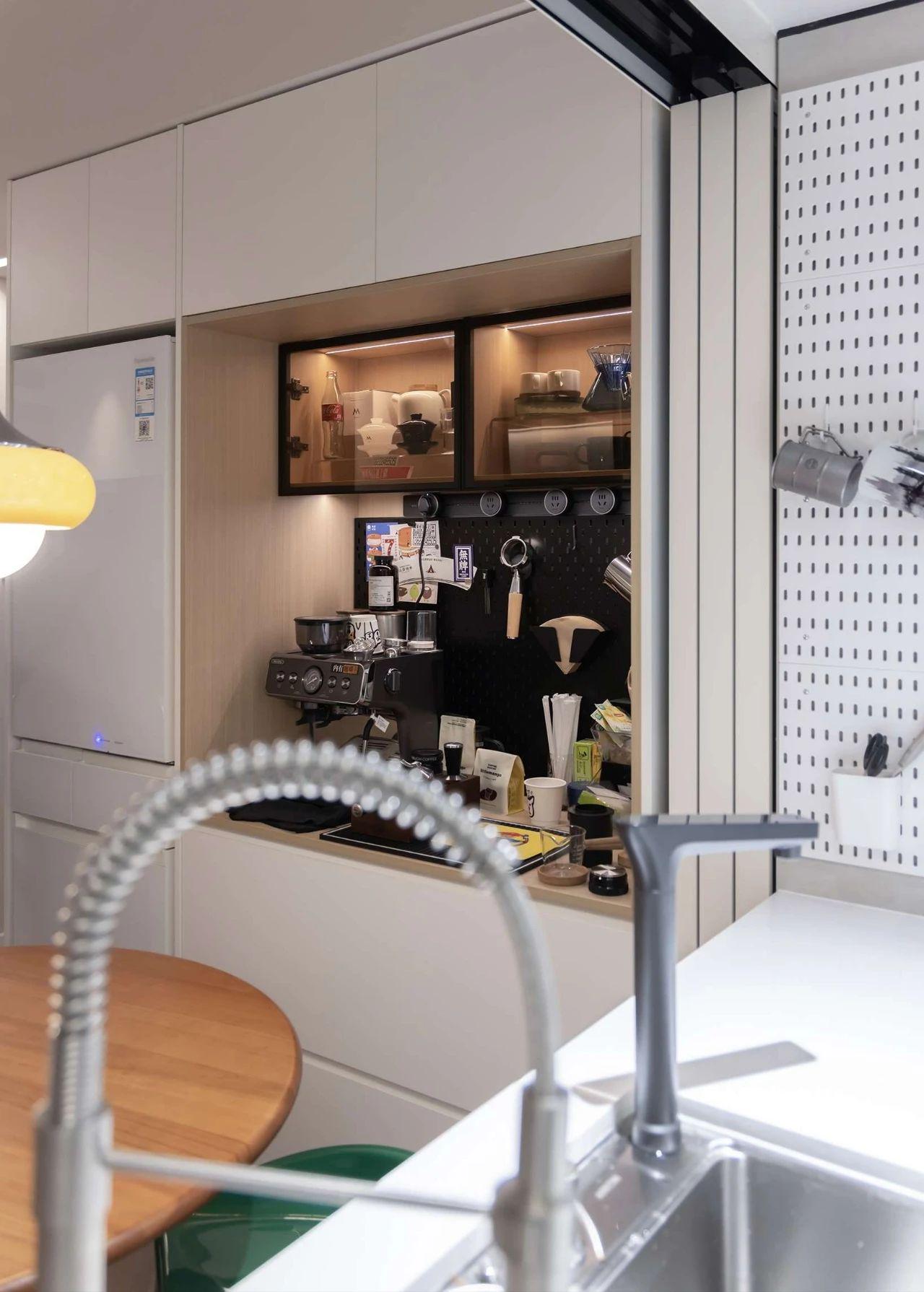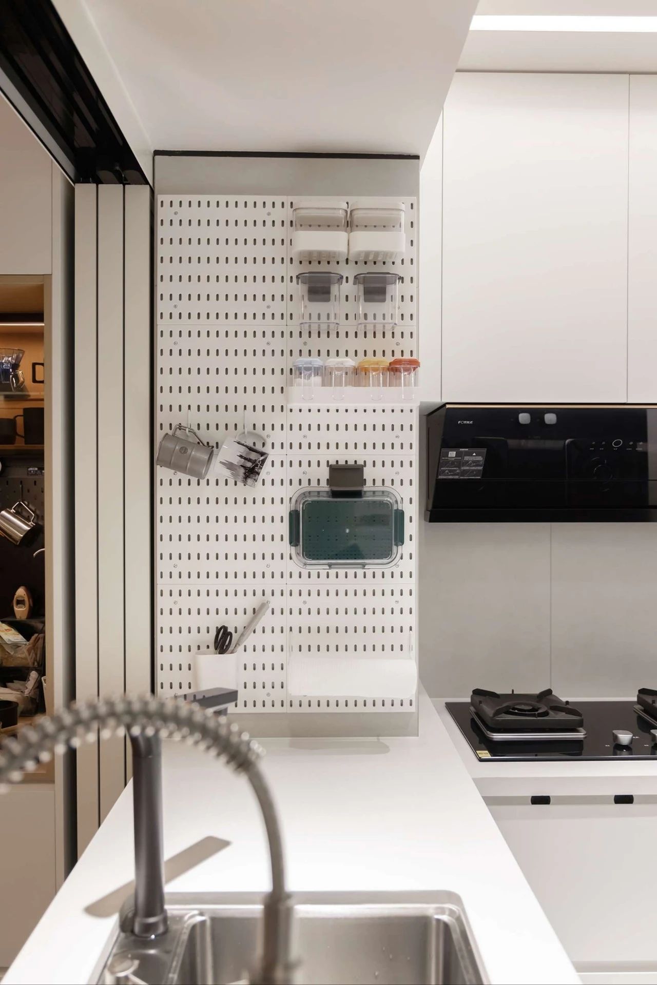 敞开的状态下,高低台设计让水槽所在的台面能够变为岛台,作为餐厅水吧的补充操作空间。洞洞板上墙,调料、干货等物品悬挂收纳,台面保持整洁宽敞。